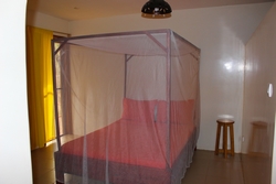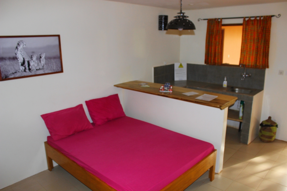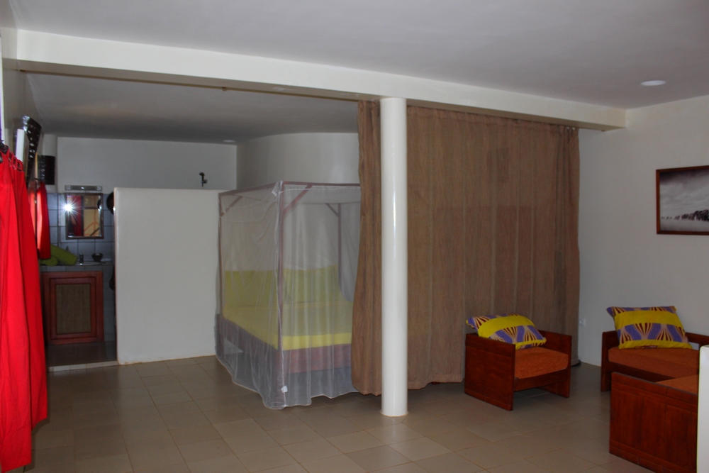 Composé de 1 pièce. Lit double avec moustiquaire et ventilateur, un coin salon, une salle de douche et toilette.
