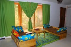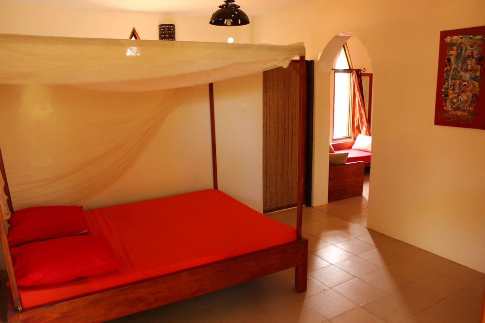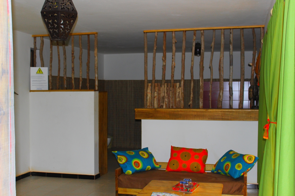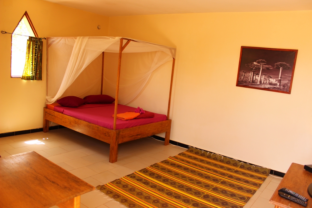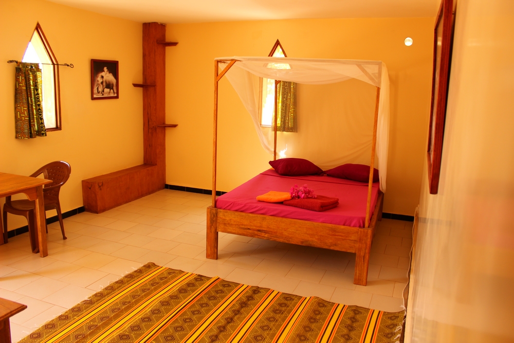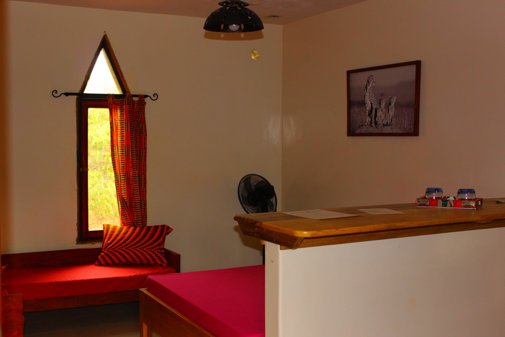 Composé d'une piece avec vue sur le jardin tropical. Un salon, 1 lit double avec moustiquaire et ventilateur, une salle de douche et toilette.