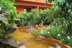 Accès au jardin tropical par la cour intérieure avec bassin à poissons.
